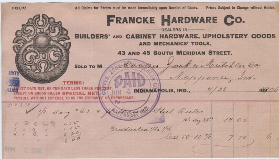 Where do I start? As you know, if you have been following these posts, we have boxes of business receipts from the early 1900s. We are slowly going through them. Every piece of paper has a story. The latest box we are looking at contained several receipts from the FRANCKE HARDWARE COMPANY, 43 and 45 South Meridian Street, Indianapolis, IND. As an estimate, I would guess we found 50 receipts from Francke Hardware Co in one box, all dated 1905-06. At this rate there are bound to be more in other boxes.