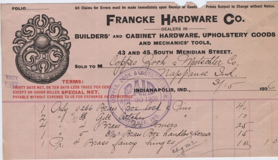 If you think about it, the Coppes companies would have needed several kinds of basic hardware to operate the business. Nails, screws, drawer pulls, hinges, cabinet locks, are but a few items that were regularly ordered from Francke Hardware Co. All the shipments were shipped to Nappanee by the B & O Railroad. Some orders went through Francke Hardware but were shipped directly from the manufacturer, and in those cases, there usually are two railway freight receipts pined with the main receipts.