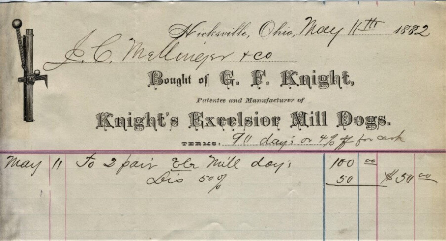 A second receipt I want to show is from May 11th, 1882. J. C. Mellinger & Co. purchased 2 pair (does 2 pair mean 4? ) of Excelsior Mill Dogs at a price of $100.00. There was a 50% discount, so the total cost to Mellinger was $50.00.