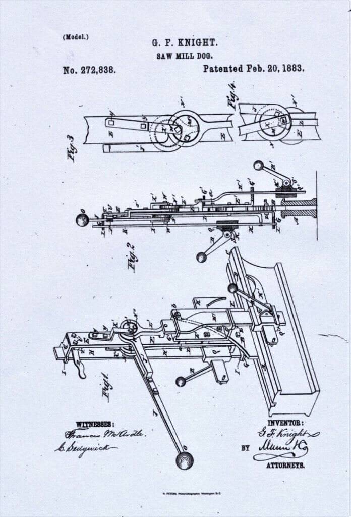 I found the patent drawing for a Knight Mill Dog, but notice the date on the patent drawing is eight months after the date on the receipt selling a patented mill dog. The Knight’s patent mill dog apparently worked very good for the Coppes Bros. as they were promoting themselves as being agents (dealers?) for the Knight’s Patent Mill Dog in the local newspaper in 1881.