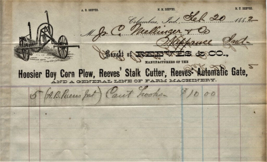 The first receipt I want to show is from REEVES & CO., Columbus, Ind., manufactures of the HOOSIER BOY CORN PLOW, REEVES’ STALK CUTTER, REEVES’ AUTOMATIC GATE, and a general line of farm machinery.