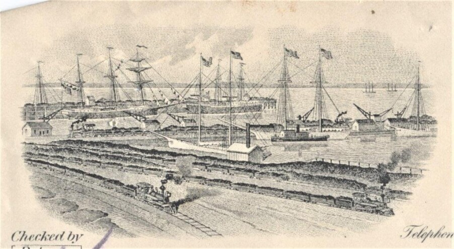 The above drawing is illustrated on the top of The W. L. Scott Company’s receipts and is intended to show the scope and the potential size of the business. You can see several coal trains and coal ships, implying that the company is shipping coal everywhere. I love these old industrial illustrations; someone should collect them.