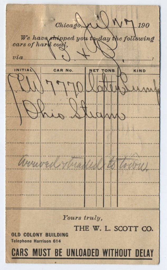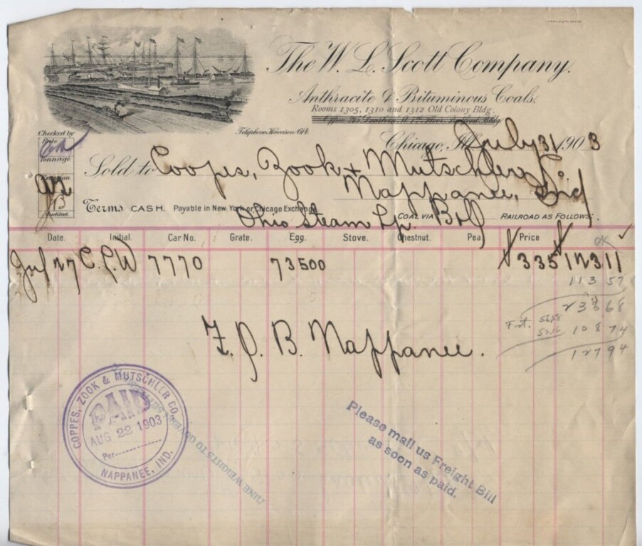 These coal receipts are from the stash of old Coppes, Zook & Mutschler Co. business receipts. This latest box has receipts dated between 1902 – 1906. I’m sure we don’t have all the receipts from any one company in the same box. What we do have from this company covers the period from May 22, 1903, to Feb 12, 1904, almost a full year. In this box there were nineteen coal receipts from the W. L. SCOTT Co. Chicago, Ill, covering shipments in 24 railroad cars ( some receipts listed 2 cars). We will likely find more coal receipts in other boxes. I think the price is consistent at $3.50 per ton, but less the cost of shipment. C,Z & M Co. purchased 710 tons of coal in this period at a cost of $2485.00. The freight cost is only noted on a few of the receipts and usually amounted to approx. $60.00 per rail car, depending on the net weight. If I multiply the avg. freight cost ($60.00) times 24 railcars and subtract that amount from what C,Z & M Co. paid, the answer will be $1045.00, or about $1.47 per ton of coal.