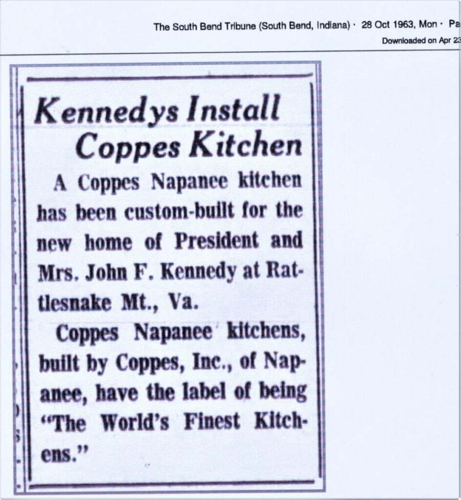 In THE SOUTH BEND TRIBUNE, 28 Oct. 1963, I found this short notice about President Kennedy’s new kitchen. He was assassinated before he could enjoy “THE WORLD’S FINEST KITCHENS.” I think this is proof of one Kennedy kitchen, but not as the street rumors suggest: a Coppes kitchen in the KENNEDY WHITE HOUSE or at CAMP DAVID. Wonder if the President and First lady had any input in the selection of a Coppes Kitchen, or was the decision to install a Coppes Kitchen made by an architect or designer?