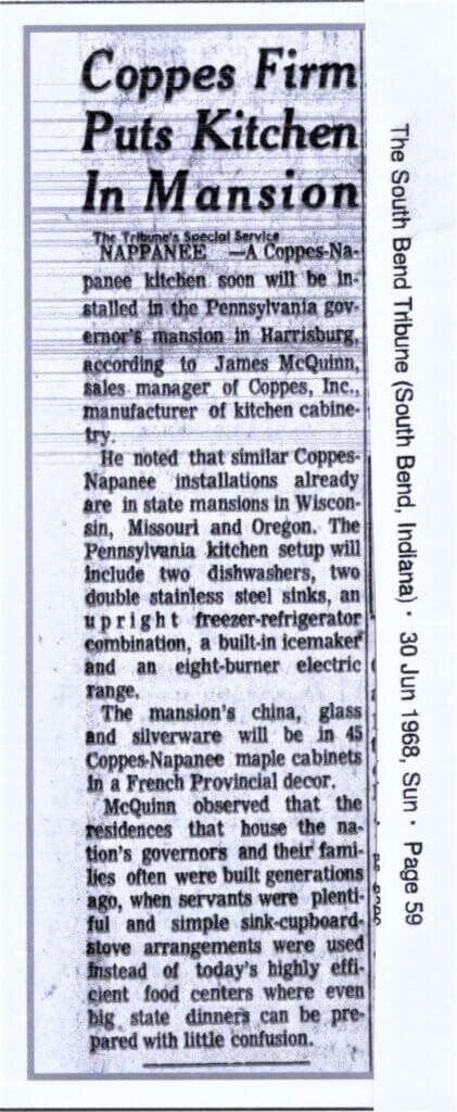 Another interesting newspaper item I found talks about the installation of Coppes Kitchens in the Governors’ Homes in the states of Wisconsin, Missouri, Oregon, and Pennsylvania. This article was also in THE SOUTH BEND TRIBUNE, 30 July 1968. Interesting sidebar: the Pennsylvania governor’s “mansion’s china, glass and silverware will be in 45 Coppes-Napanee Maple cabinets in a French Provincial décor.” That’s quite a large kitchen, wonder if there was a smaller kitchen for the personal use of the Governor’s family. On a personal note, I distinctly remember looking at the high-water mark on the Pennsylvania Governor’s Mansion after the hurricane Agnes flood of 1972. The high-water mark was at the height of the top of the 1st floor. At that time, I had no idea I would later be interested in the brand of kitchen installed in the mansion. Wonder if the kitchen was saved or needed to be replaced after the flood.