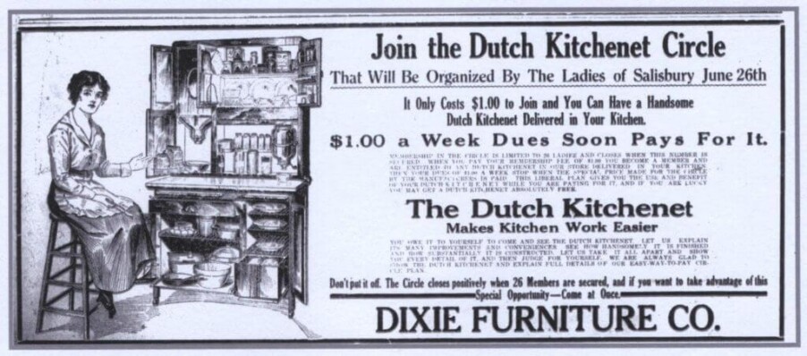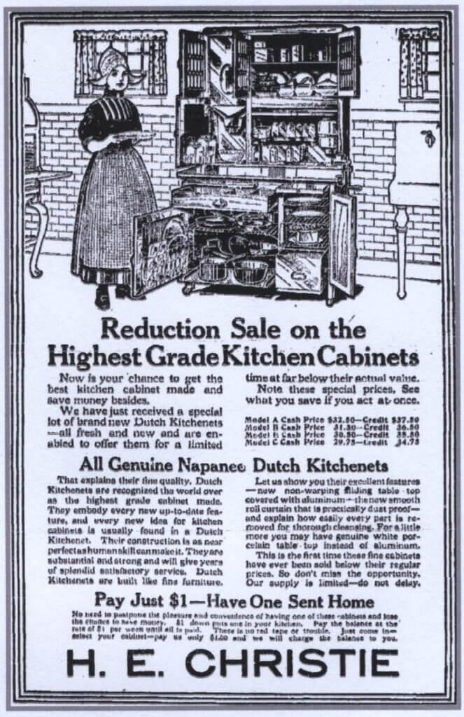 There is a much greater variety of advertising being used for selling the Napanee Dutch Kitchenets than I ever imagined. I found full-page advertising for upcoming Napanee Dutch Kitchenet sales, advertising with time limits (a two-day sale), and a sale named the “Napanee Dutch Kitchenet CIRCLE sale.” The Circle sale was limited to the first 26 ladies to join the circle at an entrance fee of $1.00. As an incentive to join the circle, after the circle was full, one of the 26 ladies would win a free Napanee Dutch kitchenet while the remaining ladies needed to finish paying for their cabinet. Seems like a neat trick to me. The furniture store got $26.00 for the cabinet they were “giving away” and sold 25 more at full price.