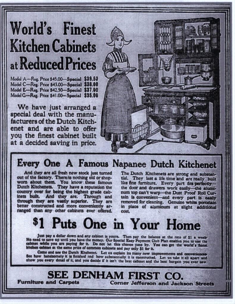 By 1916-17, there are 100s of Newspaper’s store advertisements competing to sell the Napanee Dutch Kitchenets. In the Coppes Commons historical paper collections we have a few (5-6) of the Newspaper blank copy ads. The company would provide these to furniture stores so that the stores could insert their store name and place the advertising copy in their local newspapers.