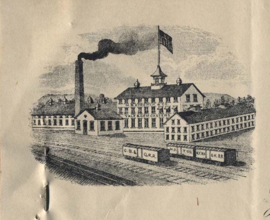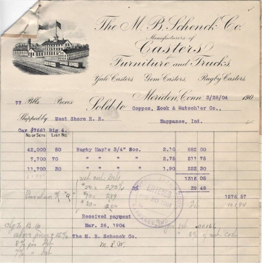 Where have I come across this fantastic bit of information? you may wonder. I was digging into another box of the old business receipts from the early days of Coppes, Zook & Mutschler Co. and found this wonderful information. In 1903 & ’04 the C, Z & M Co. was purchasing casters by the barrel full from the M. B. SCHENCK CO. Manufactures of CASTERS for Furniture and Trucks. Meriden, Conn.
