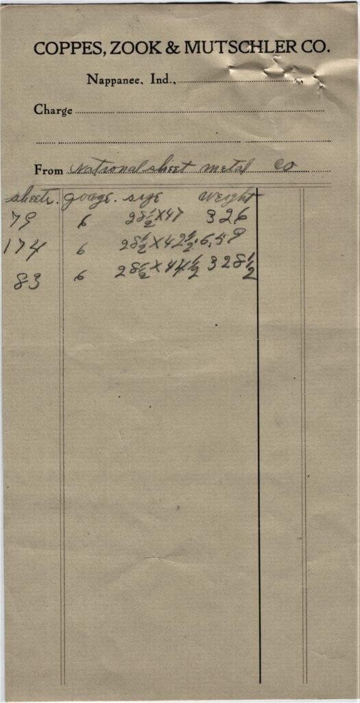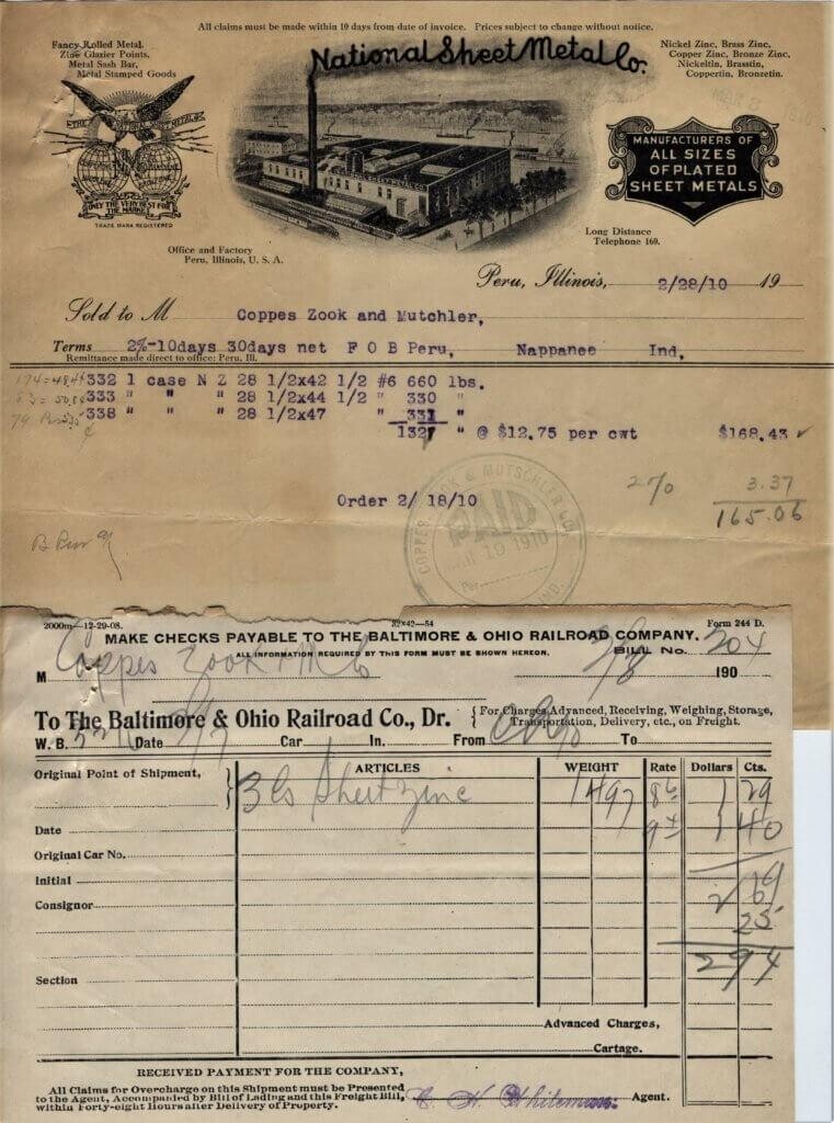 Today, I have on my History Detective Hat as I attempt to explain some more of the company receipts that we have uncovered. In this most recent box we have dug into, we have found 18 receipts from the National Sheet Metal Co. of Peru, Illinois. All the receipts are from 1909-1911. This company supplied the “Sheet Zinc” metalwork surface that C,Z & M Co. put on the kitchen cabinets. It still amazes me the sheer volume of material that the company needed to make the cabinets that they produced.