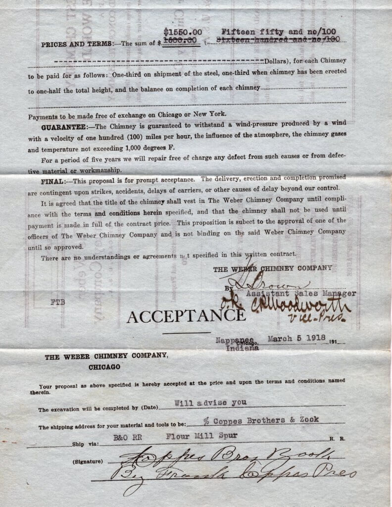 The proposed chimney at the Coppes factory and flour mill were only going to be 83 feet and 6 inches high. Seems tiny compared to the one in Japan. The proposed price of this work was $1550.00 for each of the chimneys. The contract was signed by an Assistant Sales Manager from the Weber Co. and Frank Coppes, Pres. Of Coppes Bros. & Zook.