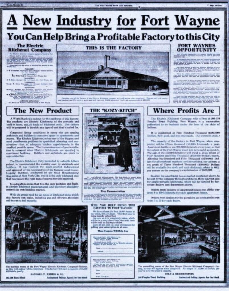 The earliest advertisement for this company was dated 1917, then on the 22th of Dec. 1919, there was a full-page ad in the Fort Wayne Sentinel touting the wonderful opportunity that people could take advantage of by purchasing STOCK in this new proposed company (No buildings yet). The advertisement explained the business plan of the company, how they were going take advantage of the exploding need for kitchen cabinets in new housing and apartment buildings. Indeed, one of the main selling points from this company was the value of having a KOZY-KITCH installed in new apartments. Several classified type ads listed apartments having a KOZY-KITCH as a selling point.