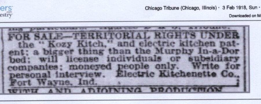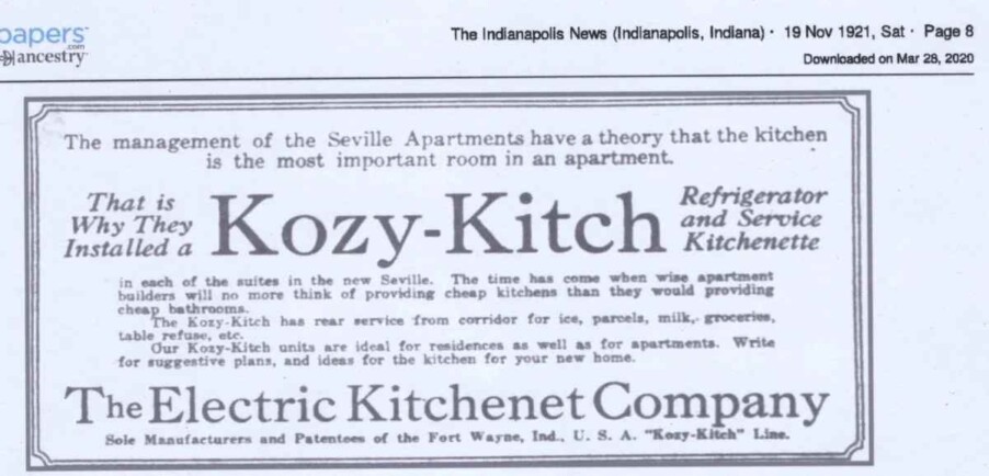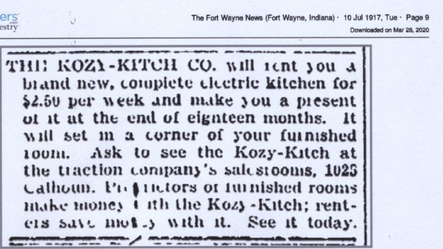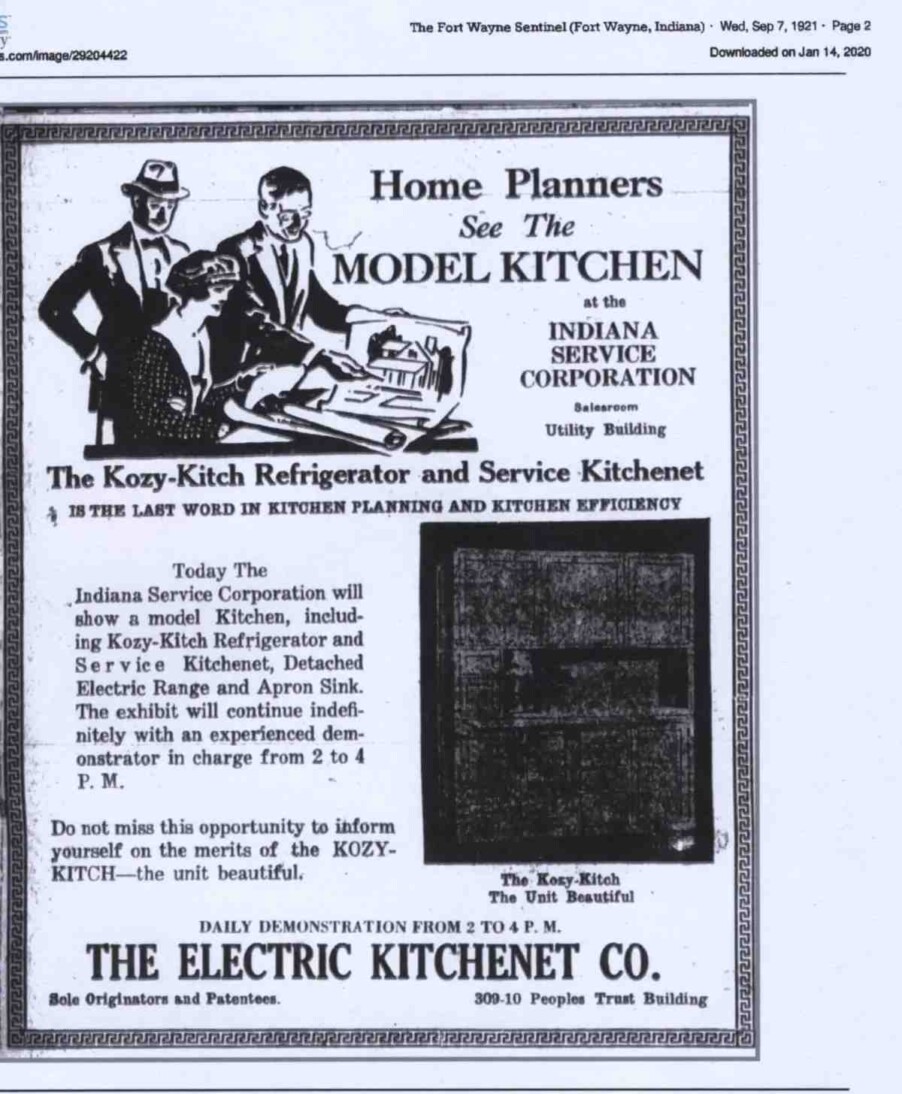 Another item that I have been searching Newspapers.com for is advertisements from all those other 65 companies. Finding an advertisement would validate their being listed with other companies that made kitchen cabinets. Well, yesterday I found a new company (new to me) from Fort Wayne. What makes this new company the most interesting is the cute names they used. The name of the manufacturing company was The ELECTRIC KITCHENET CO., with the kitchen cabinet they produced called the “KOZY-KITCH”.