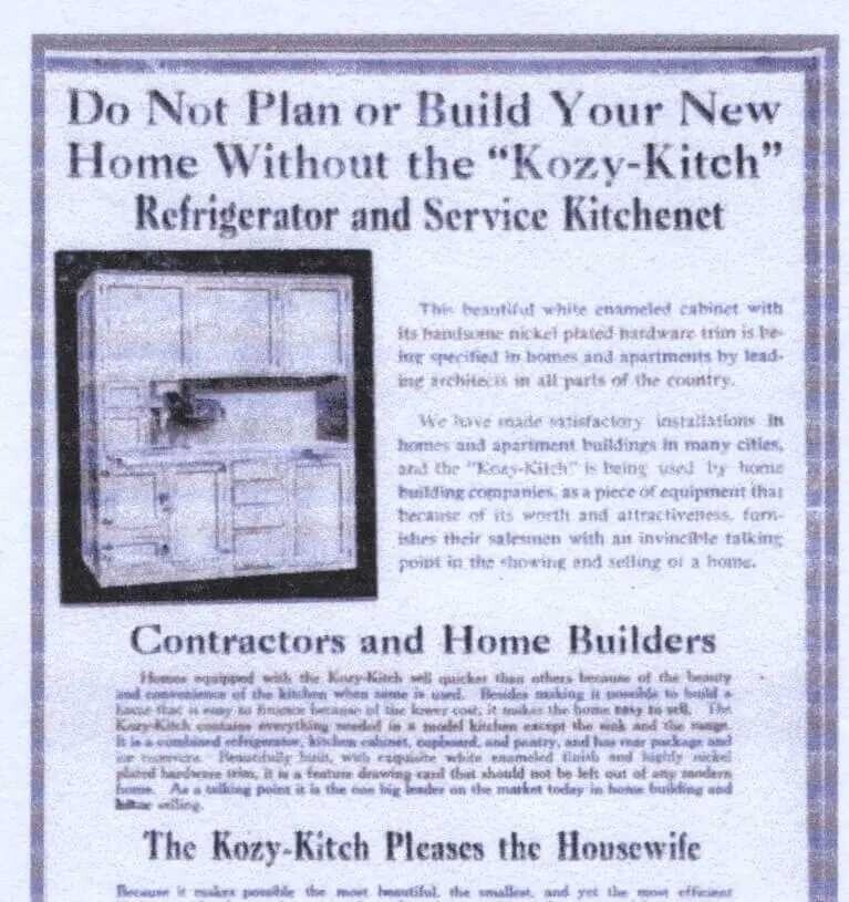 Another ad recommended having the cabinets produced on contract with another firm. In 1918 this company was selling “territorial Rights” to “moneyed people only” to promote the KOZY-KITCH in a Chicago newspaper advertisement.