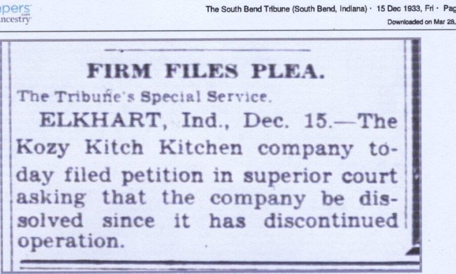 The final advertisement I want to show is from 1933. In the South Bend tribune was a notice to dissolve the company. This company lasted approx. 15 years, from 1918 to 1933. Sure would be fun to find one of these KOZY-KITCH cabinets. Wonder if they put their name on the cabinets?