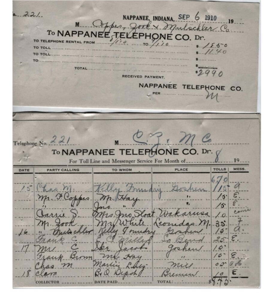 We have found a stack of receipts from the Nappanee Telephone Co. It appears that each prominent member of the C, Z & M Co. management team had a telephone in their office. In 1911 the rental for each telephone was $1.00 per month. Long distance calls were recorded by hand (probably at the telephone office by the operator). In the early days of the telephone exchange, long distance calls could only be made at the Coppes Hotel, which held the only toll station in town.