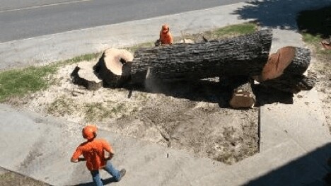 These trees were huge, the tree cutters started by trimming the top limbs into small sections and letting them down to the earth with ropes. The crew had the largest bucket truck I have ever seen. That allowed them to reach the treetops safely without climbing the tree itself. If they would have dropped the tree sections from such a height the sidewalk would have been broken and maybe a section could have bounced into the street, causing an accident with a car or truck. Very professional cutters, they were. Setting barricades in the street to protect the traffic and wearing PPEs for personal protection.